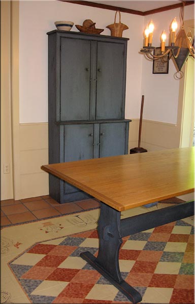 Matching trestle table and stepped-back cupboard accented by a reproduction hand-painted floor cloth. |